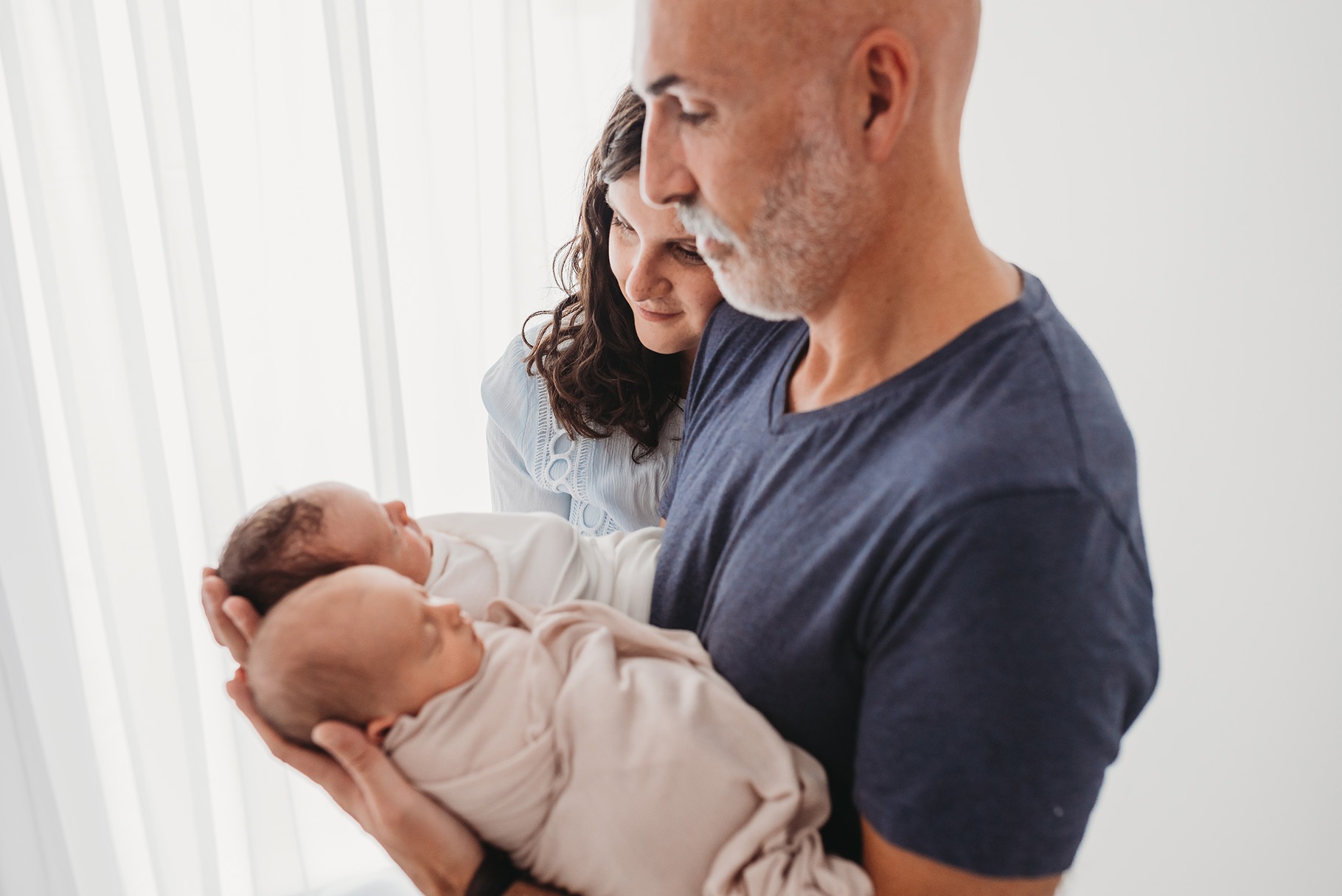 Newborn photography in Melbourne capturing twins. Two multiple girls in studio capturing this precious moment of multiples children with double the love to give.
